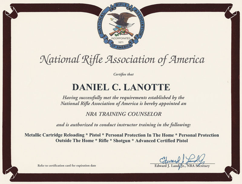 NRA_DanLanotte_TrainingCounselorCert_800x609 Featured in: NRA_DanLanotte_TrainingCounselorCert_800x609. Full size image: 800 × 609. Post navigation Previous ImageNext Image Leave a Reply Cancel replyYour email address will not be published. Required fields are marked *Comment * Name * Email * Website Save my name, email, and website in this browser for the next time I comment.